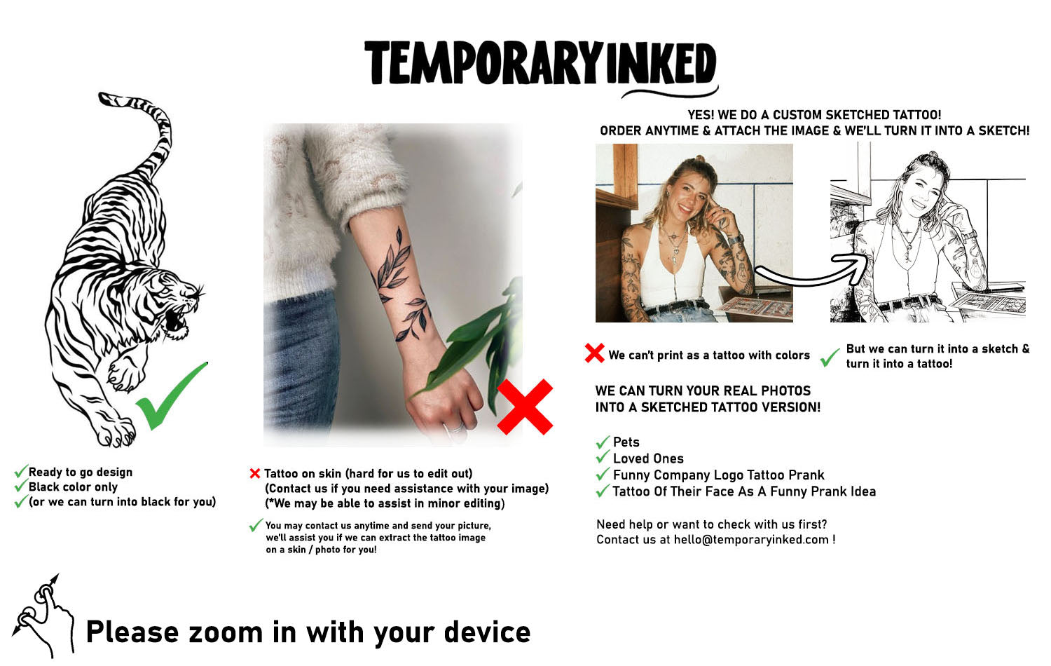 We recommend you use images that is print ready like a sketch drawing, digital art in white background. All Custom Tattoos come in black color.