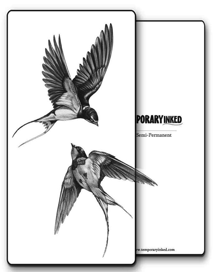 Experience the refined artistry of the 'Aerial Harmony Tattoo,' showcasing two birds in elegant flight with intricate detail, capturing the essence of freedom and movement.