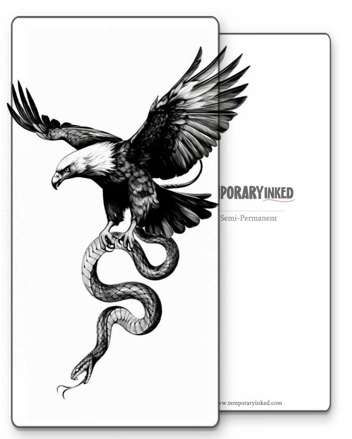 Eagle Snake Tattoo: Capture the eternal struggle between sky and ground with the Eagle Snake Tattoo, illustrating the fierce eagle in combat with the cunning snake. This striking design symbolizes wisdom and renewal, appealing to those who value the balance of power and intellect.