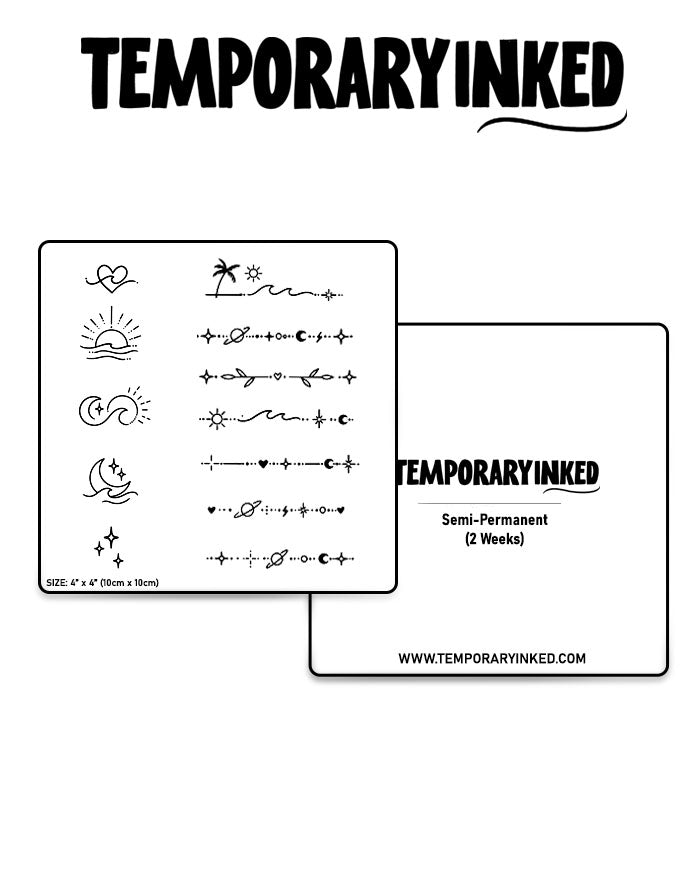 Duration: Our Semi-Permanent Tattoos are designed to last up to 2 weeks, depending on the application area, daily activities, and skin moisture & aftercare.