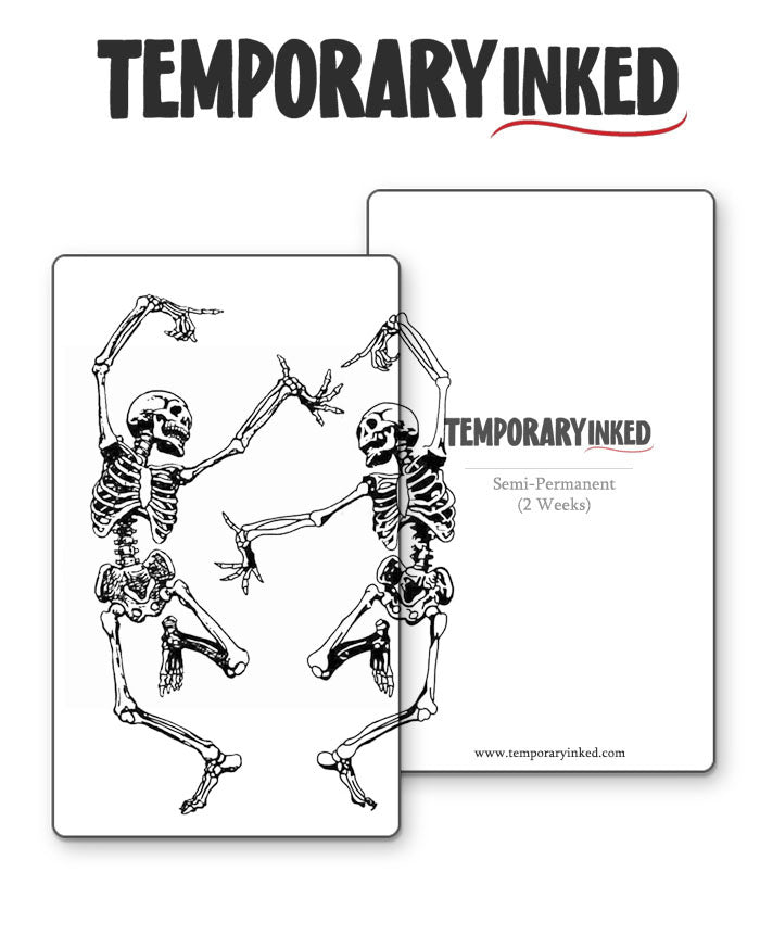 Celebrate the spooky season with our Halloween Dance Tattoo, showcasing lively skeletons in a festive dance. This unique 2 Week Semi-Permanent Temporary Tattoo is perfect for Halloween parties.