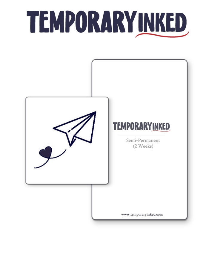 "Lover's Flight" Tattoo captures the whimsy of romance, depicted as a paper plane carrying a heartfelt symbol on its journey.