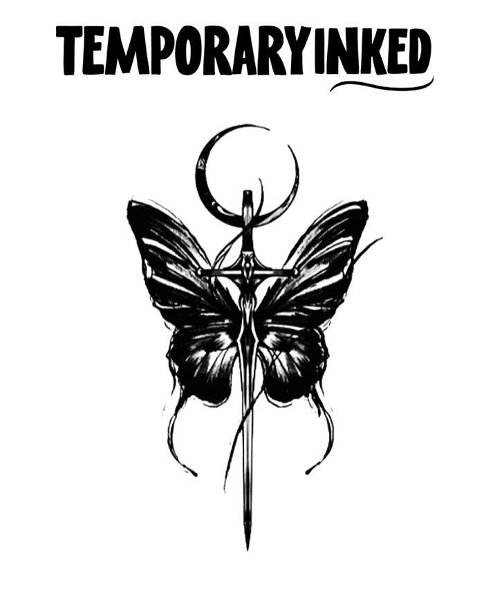 Lunar Wingblade Tattoo: Embrace the mystique of the 'Lunar Wingblade,' a captivating tattoo design that melds the ethereal elegance of butterfly wings with the sleek, sharp allure of a moonlit blade.