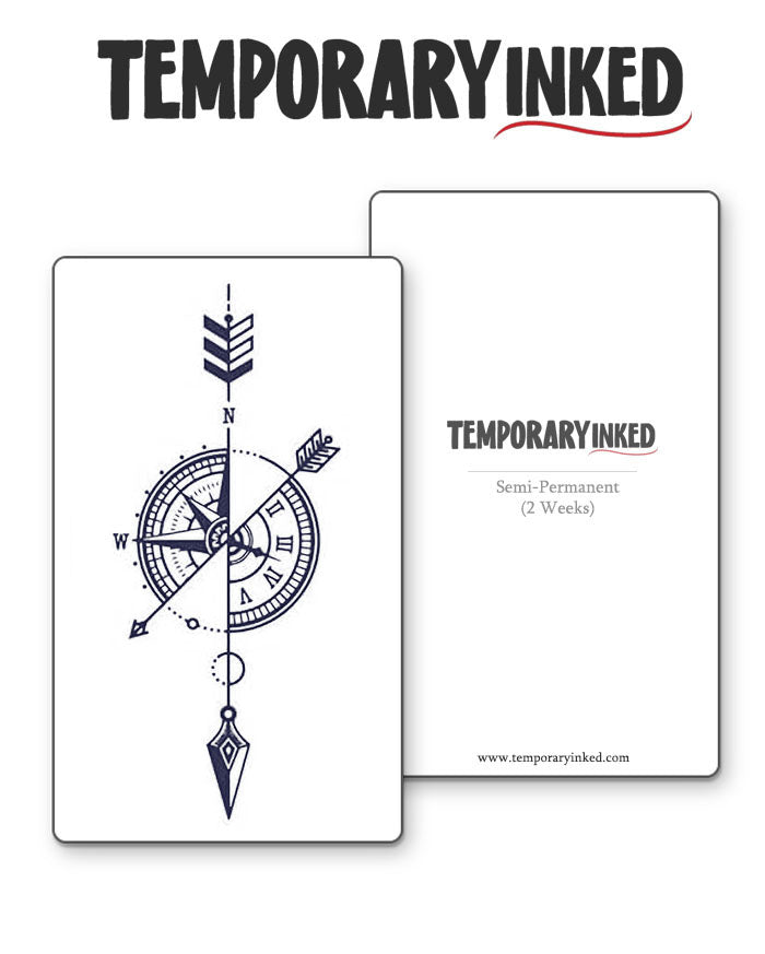 The 'Pathfinder Tattoo' features a meticulously detailed compass and arrow, symbolizing the pursuit of direction and the determination to always find your way.