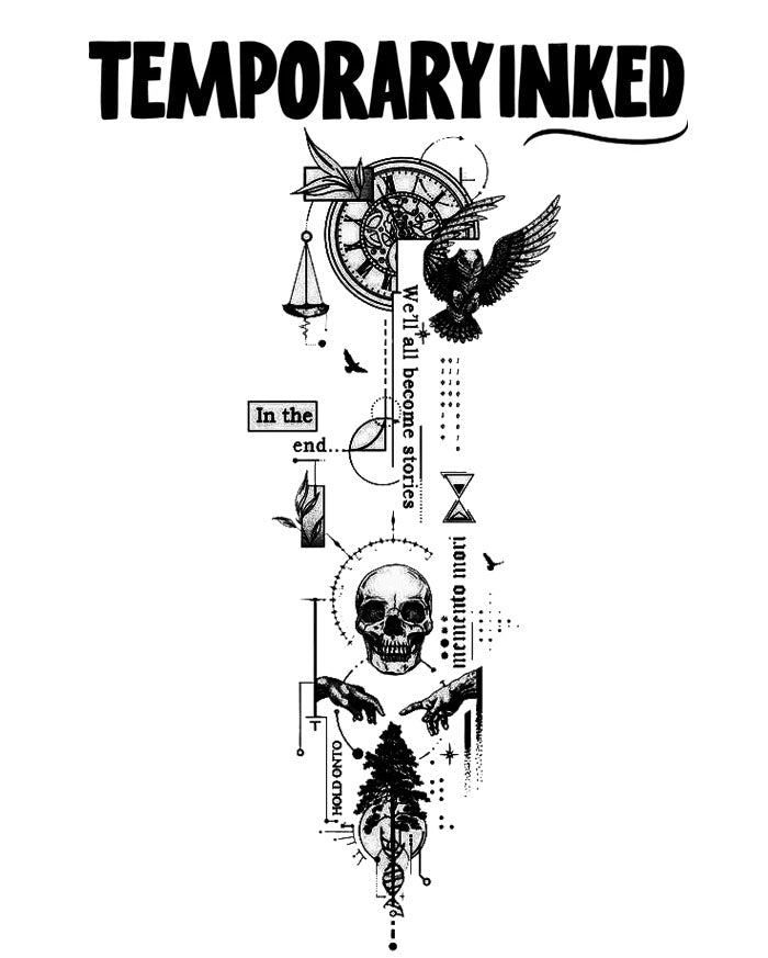 Delve into the depths of history and storytelling with the Timeless Narratives Tattoo XL, featuring elements that span from ancient clocks to celestial owls. This piece serves as a reminder that in the end, we all become stories etched in time.